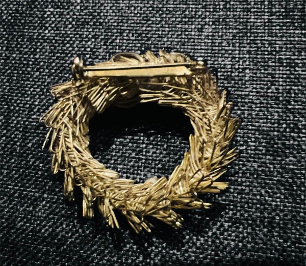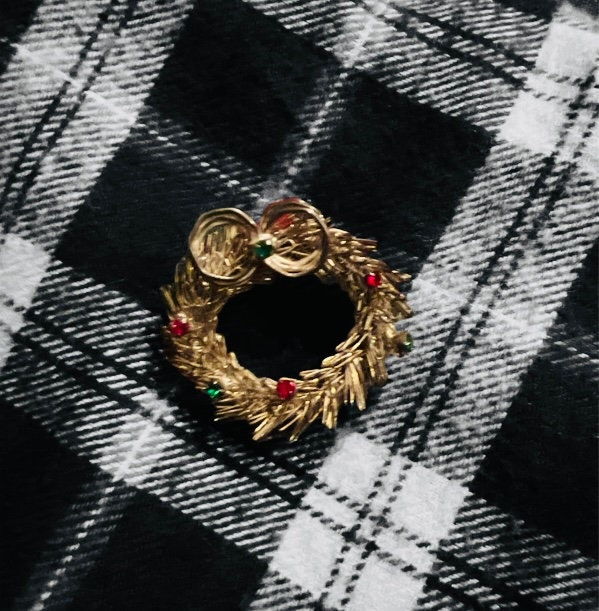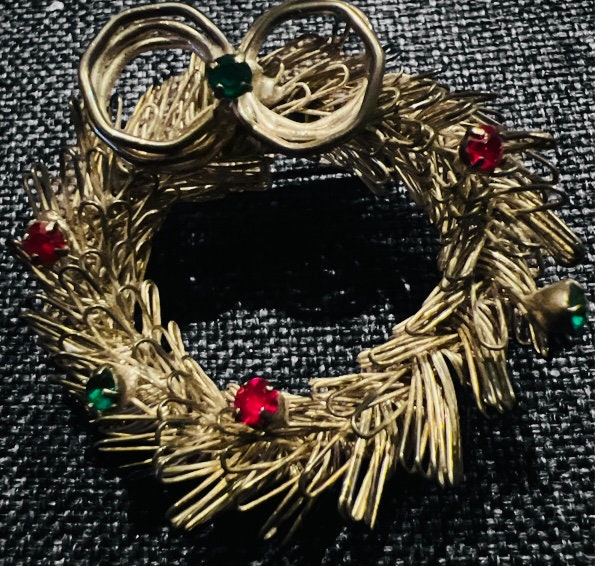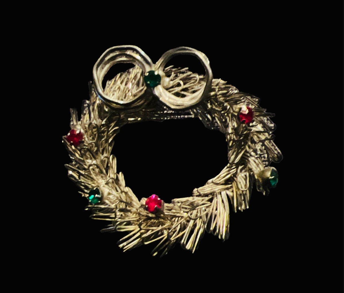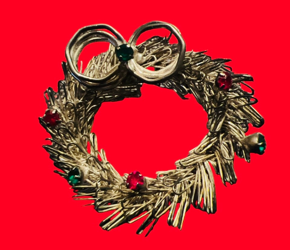 This is a vintage antique Christmas Wreath originated in 70’s silver with wreath shape and red and green stones. Antique looking wreath.
